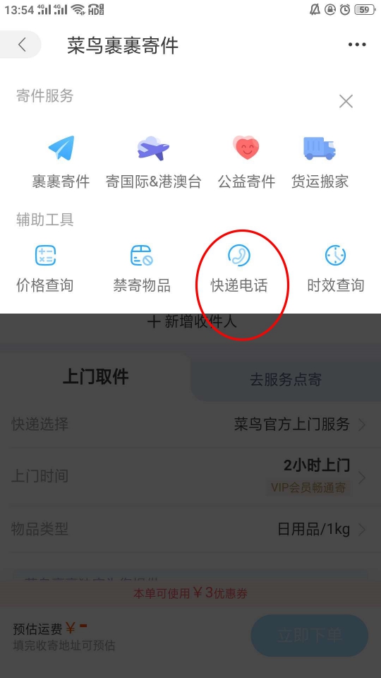 2、在弹出来的选项中选择快递电话,联系想要寄的快递。