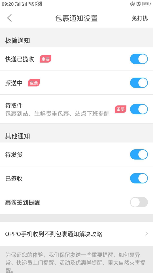 2、在包裹通知设置中选择自己需要或不需要的通知,进行选择。