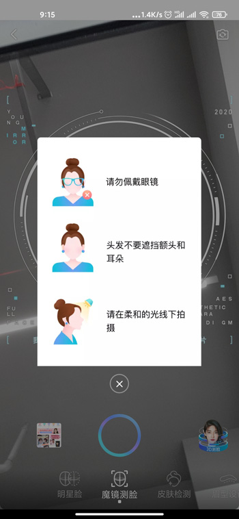 6.使用前置摄像头开始脸型测试,请勿佩戴眼镜,头发不要遮挡额头和耳朵,请在柔和的光线下拍摄。