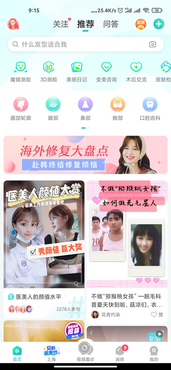 5.在新氧医美首页点击左上角的【魔镜测脸】功能;