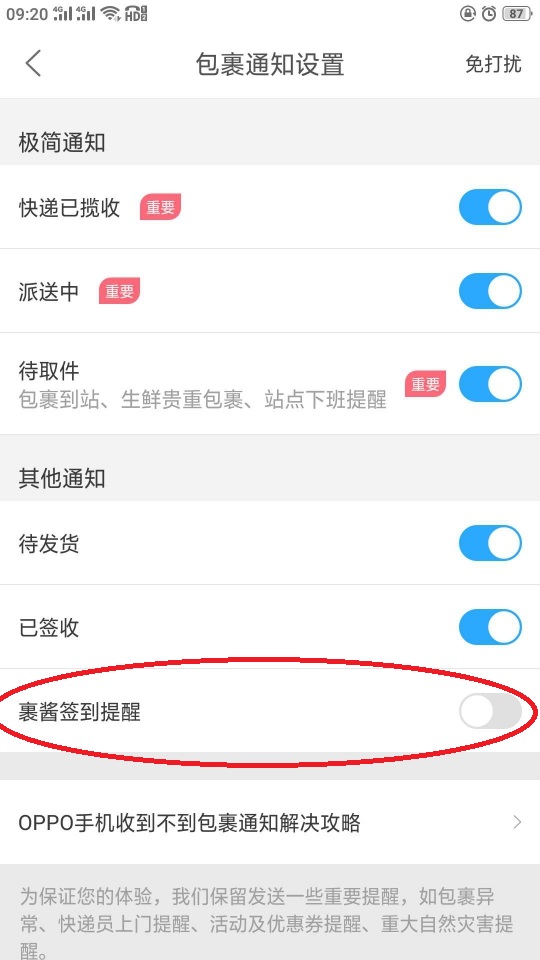 2、在包裹通知设置中看到果酱签到提醒,打开就可以了。