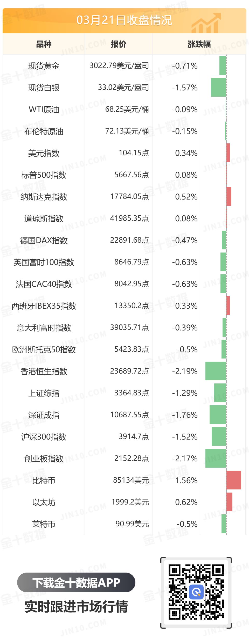 受美元走强和投资者获利了结的影响,现货黄金美盘一度跌破3000美元关口,回调约40美元,但因地缘政治和美国经济的不确定性挥之不去,最终收复3020大关,收跌0.71%,报3022.79美元/盎司。现货白银最终收跌1.57%,报33.02美元/盎司。