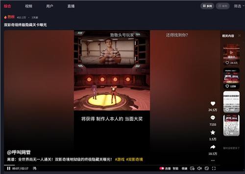 该关卡全程无存档点,旨在考验双人极致配合 —— 两人完成的关卡的误差时间必须控制在五秒内,关卡难度逐步递增,更重要的是死后会从第一关重新开始。通关后,屏幕会播放Josef Fares亲自出镜的彩蛋视频:“首次通关者将受邀参观工作室,体验未公开新作!”这一设计曝光后,全球玩家涌入第六章尝试通关,一夜之间双影奇境隐藏关卡登上各大热搜。