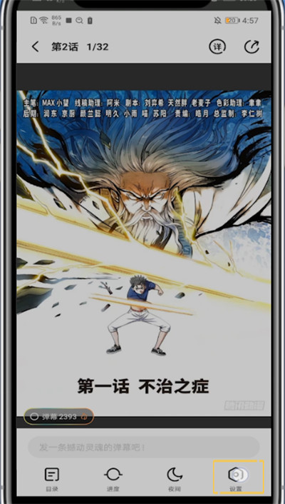 3、点击屏幕中间调出菜单栏,点击右下角的设置