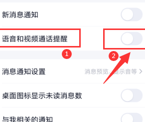 4、最后,在消息通知界面,找到“语音和视频通话提醒”那一栏,再滑动右边开关按钮,打开开关即可。
