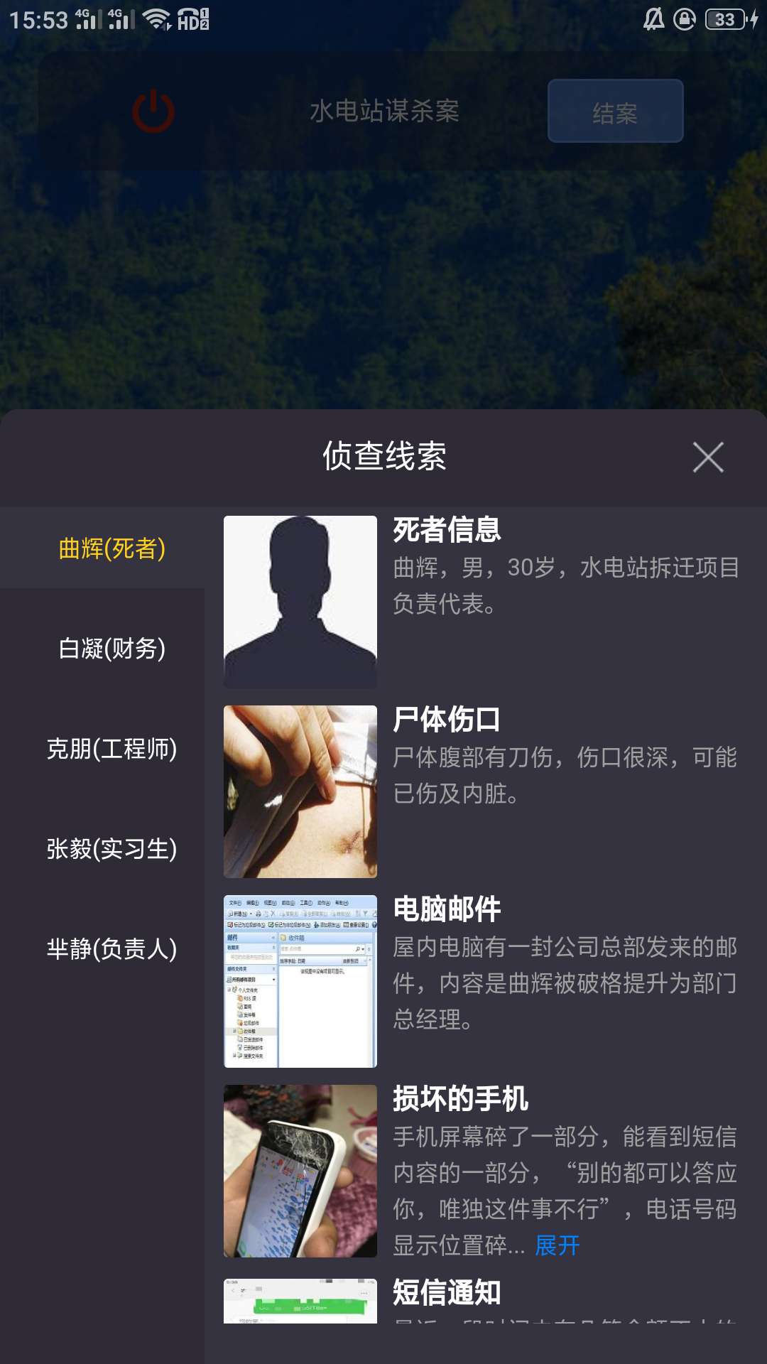 案件介绍:2020年4月10日,伊斯兰堡突降暴雨,由国内龙誊集团收购,即将准备拆迁改造的卡洛水电站因水位溢出,不得不进行紧急泄洪,当大水退去,工作人员竟发现一具尸体被冲到了岸边,经过辨认,此人正是昨日失踪的工程投资方代表曲辉,水电站除了死者外,只有少数几个工作人员留守,暴雨阻断了警方进出的山路,根据目前所有工作人员提供的线索,能否帮助他们找出真凶...