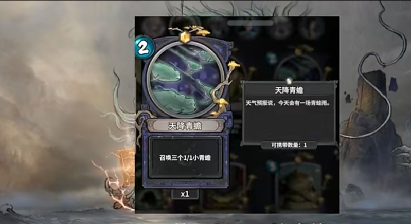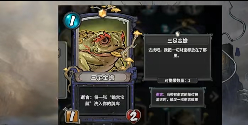 游戏中的蛤蟆本命卡可以携带的卡牌又包含了三足金蟾、微量粘液、粘液缠身、天降青蟾、碧蟾先祖、线索追踪、化形以及渡渡蛙等等。