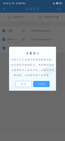 1、当我们选择好了车次之后,选择乘客信息,却提示“该乘客未完成手机号码填报核验……”,点击【去核验】