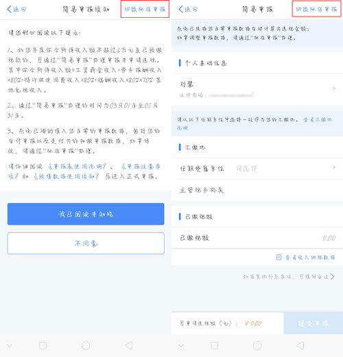 (1)简易申报非常简单,我们只需要选择任职受雇单位,之后就可以知道我们是否需要补税、退税,如果是退税,点击提交申报,等待系统审核通关就会将退税金额退回账户绑定的银行卡内;如果是需要补税,金额小于400元可以免补税,但是超过400元以上,必须进行补税,不然会影响信用值。