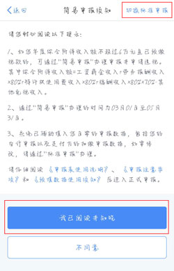 3、点击之后,会进入默认的简易申报须知界面,当然我们也可以在右上角切换标准申报,点击【我已阅读并知晓】