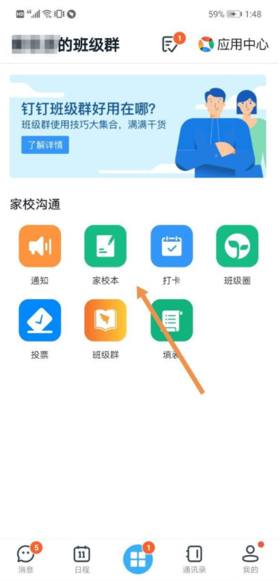 2、进入到“工作”界面,点击“家校本”。