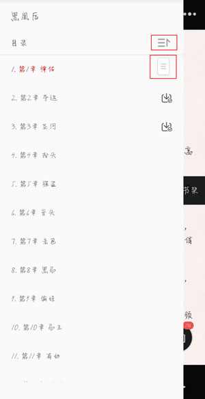 2、在左侧点击三条白杠,打开目录,目录的右侧可以查看目录的升序和降序,还可以点击滑动块,快速拉动目录