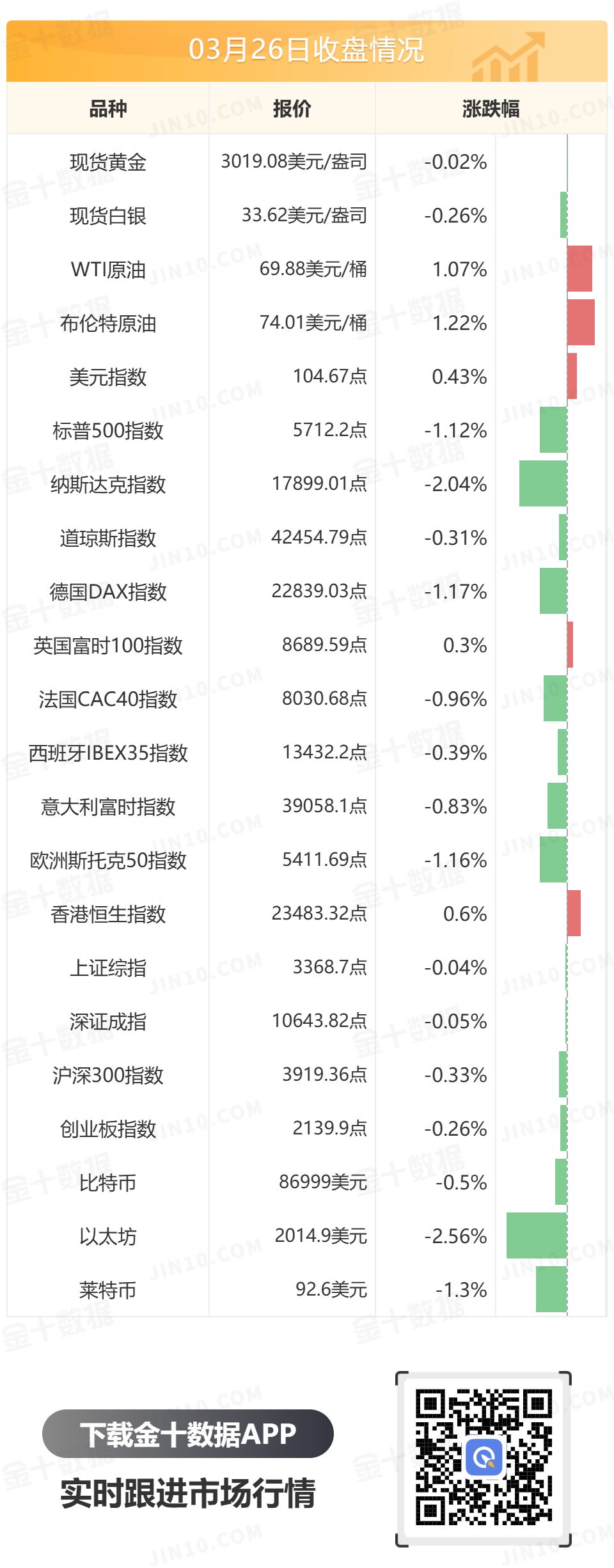 周三美盘,在知情人士称特朗普准备最快在当地时间本周三宣布汽车关税后(现已宣布对所有进口汽车征收25%关税),美元指数持续上涨,最终收涨0.43%,报104.67。基准的10年期美债收益率收报4.3530%;对货币政策更敏感的两年期美债收益率收报4.0370%。
