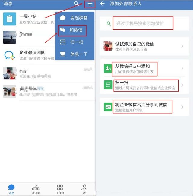 企业微信除了保留微信的手机号搜索外,还能直接添加微信好友,和微信好友互发消息,扫二维码或企业微信名片添加,等多种添加方式,可以说企业微信扩宽了微信通讯。