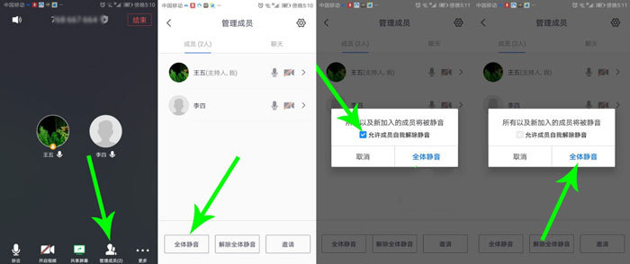 打开管理成员界面,然后点击“全体静音”。