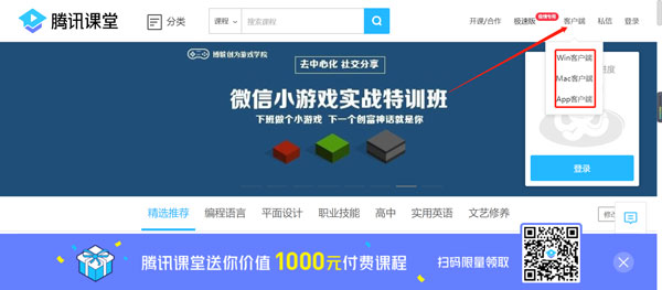 打开官网地址,进入官网首页,在右上角选择【客户端】,使用电脑进行学习的可以选择“win客户端”,使用苹果笔记本的用户可以选择“Mac客户端”,使用安卓或者苹果手机、以及平板的用户则选择“APP客户端”进行下载。