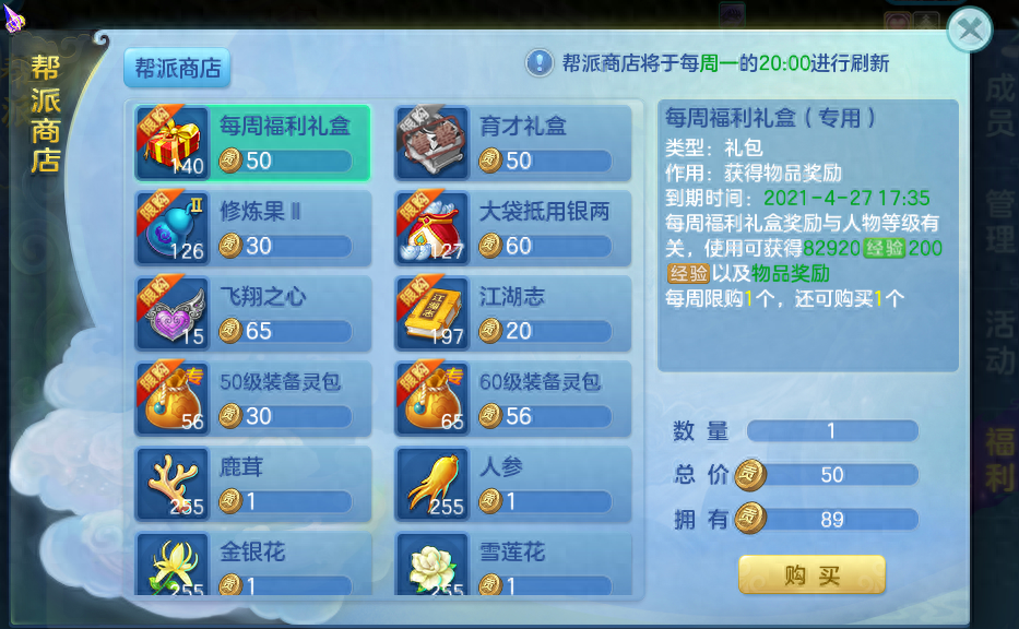 另外周末有摇钱树、雪国、帮派秘兽这些没难度的活动,有时间就可以参加,如果队友配合的好,其实奖励不错。