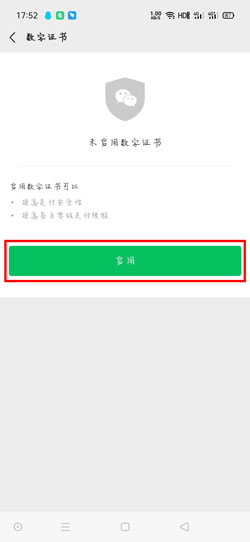 4、点击【启用】功能,启用数字证书后可以提升支付安全性、提高每日零钱支付限额;