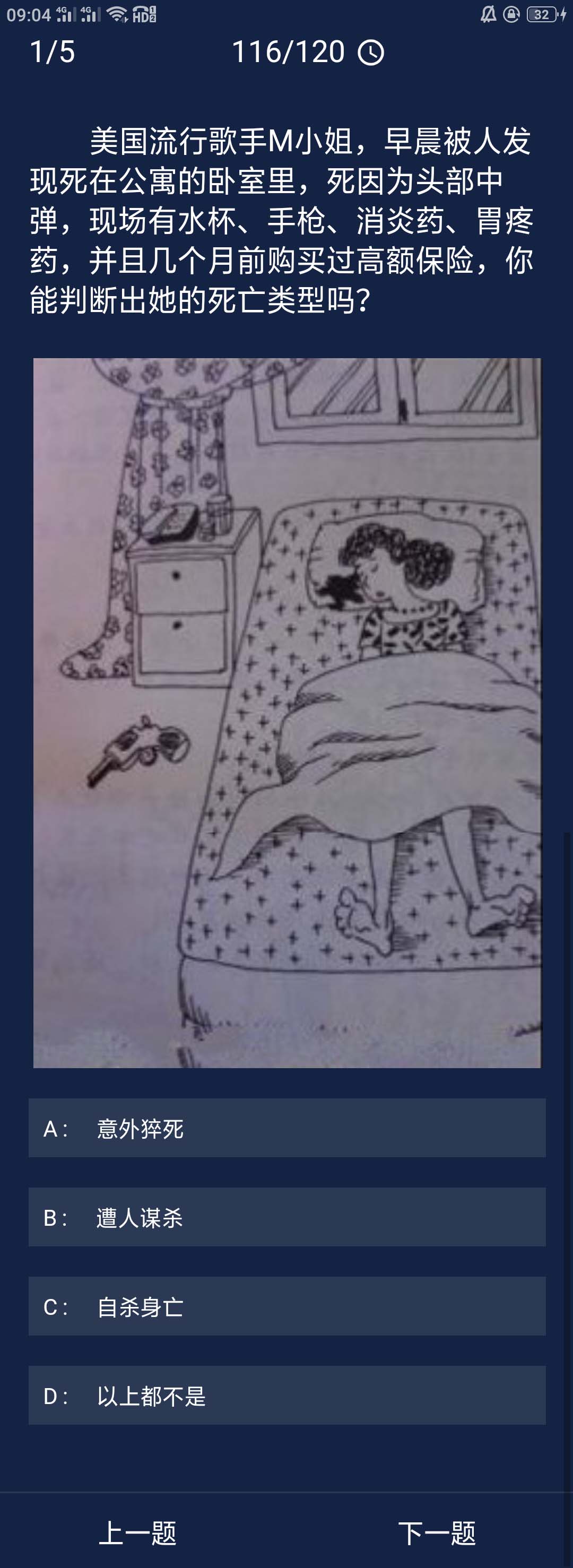 抛开其它的线索,单看死因是头部中弹,所以意外猝死肯定不是,自杀身亡的话太阳穴中弹会当场死亡,枪不会掉在地上,手也不可能伸进被子里,所以答案是遭人谋杀。