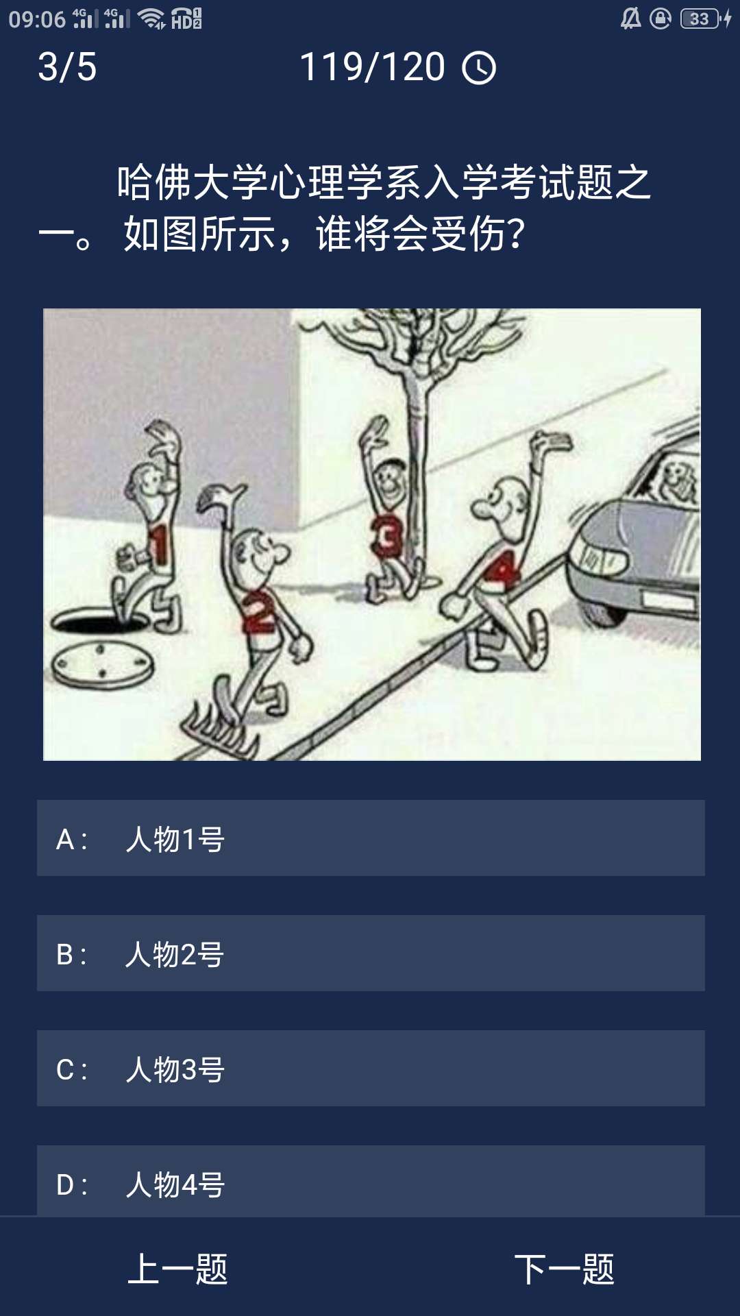 根据影子和脚尖朝向可以看出,3号从大树旁边走过并没有危险,4号和1号的视线可以相互提醒并止步,只有2号没有被人注意到,所以2号下一秒会受伤。