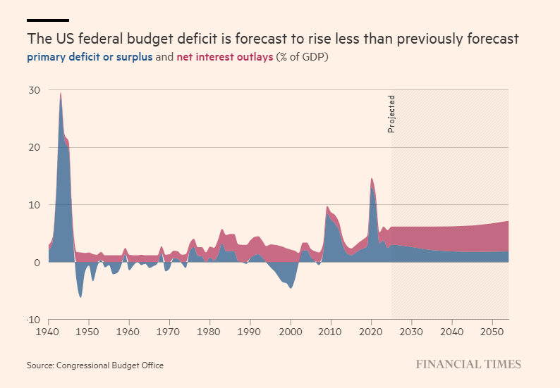 尽管债务负担的增长规模较大,但由于国会预算办公室假设利率降低、医疗保险支出减少以及收入增加,其目前预计债务扩张速度将比一年前预期的要缓和。