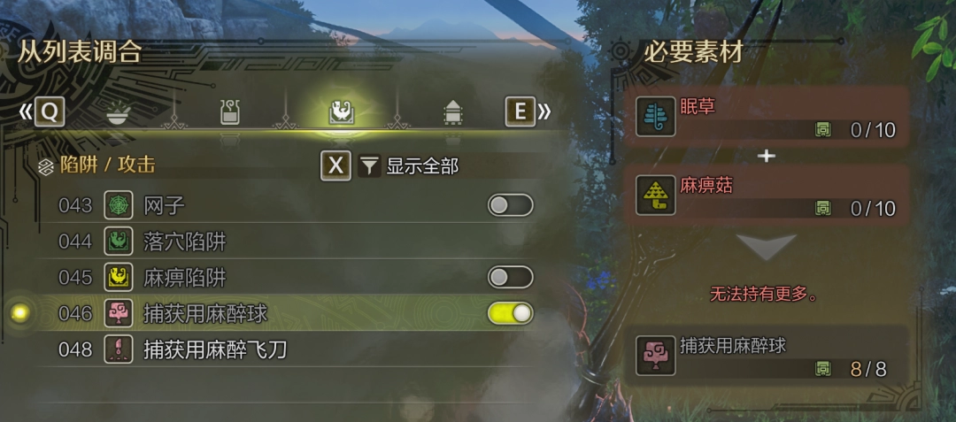 开荒路过的时候先把抓捕材料采集了。常春藤叶子,蜘蛛网,雷光虫蓄电素(抓雷光虫),然后在商店里买陷阱材料进行合成。麻醉球用眠草、麻痹菇合成。