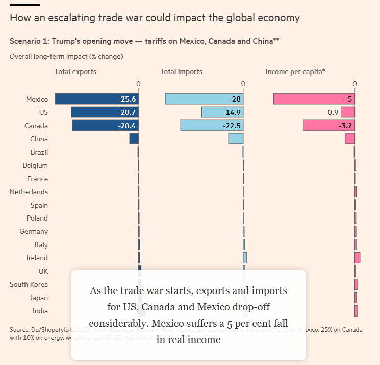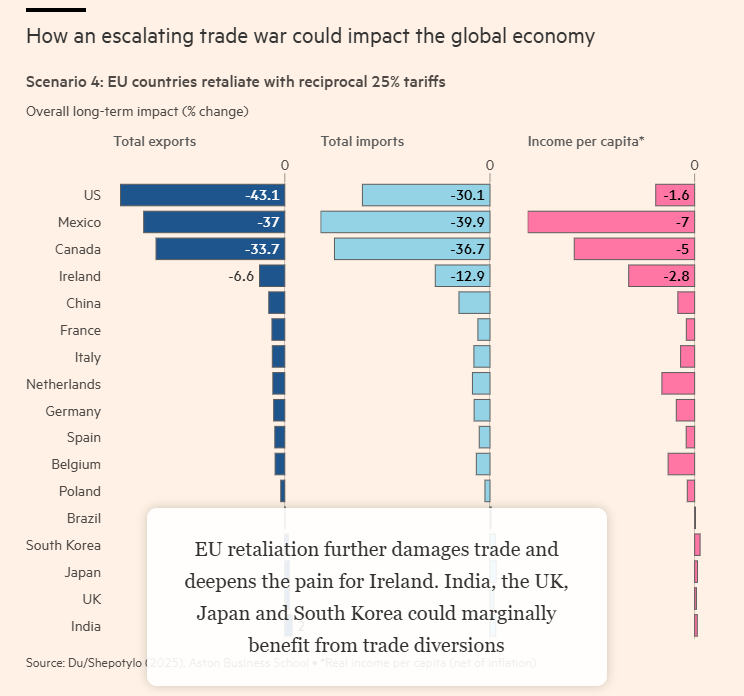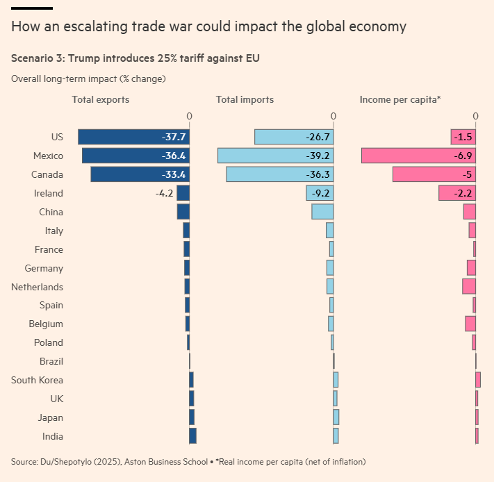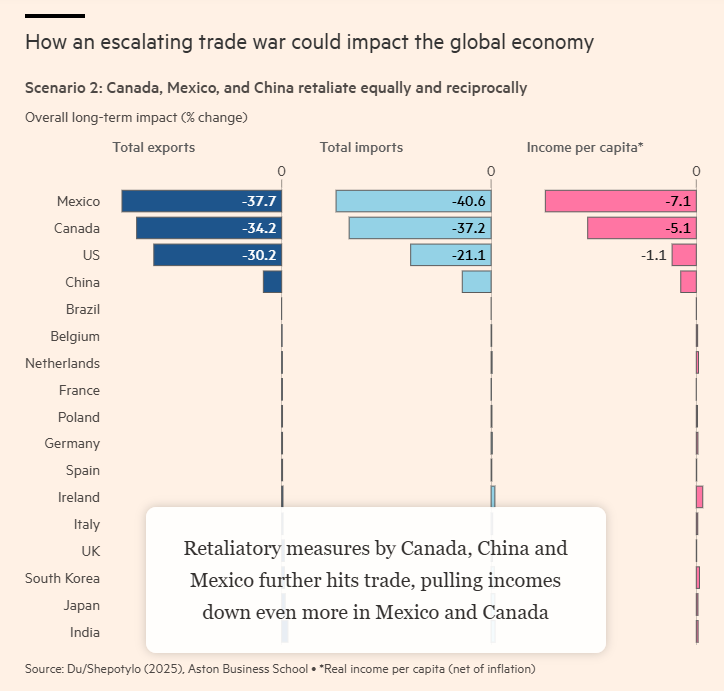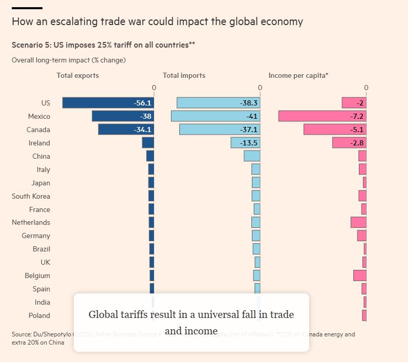阿斯顿大学经济学教授Jun Du表示,该模型显示,如果各国相互征收25%的关税,其影响将类似于1930年那场加剧了大萧条的贸易战。