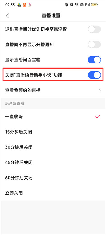 5.最后进入到直播设置的页面中开启【关闭“直播语音助手小快”功能】即可;