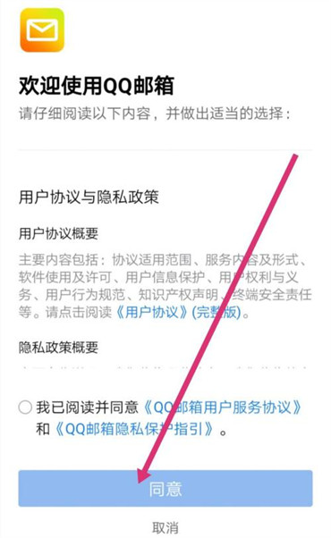 1.点击过会进入到欢迎使用QQ邮箱的页面中把“我已阅读并同意”前面的的圆圈勾选上,然后点击【同意】选项;