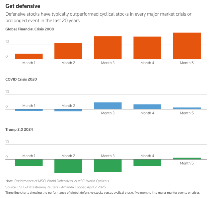 即使现在,在经济衰退尚未立即显现的情况下,自特朗普去年11月赢得大选以来,一篮子全球防御性股票的跌幅也小于一篮子周期性股票,后者此前因高价的科技股和人工智能股票而被推高,这一转变反映出了投资者的谨慎态度。