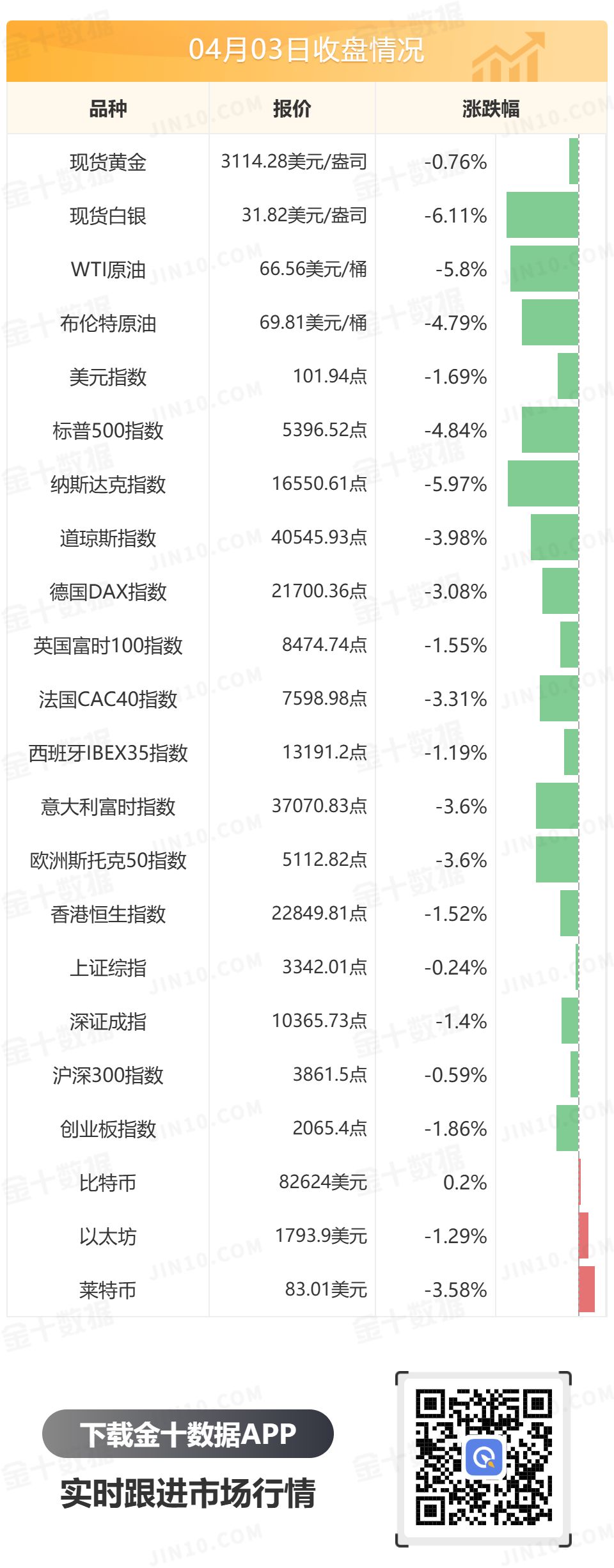特朗普征收进口关税引发的市场大跌也影响到黄金投资者,现货黄金大起大落,日内波动幅度超110美元,最终收跌0.76%,报3114.28美元/盎司。现货白银最终收跌6.11%,报31.82美元/盎司。