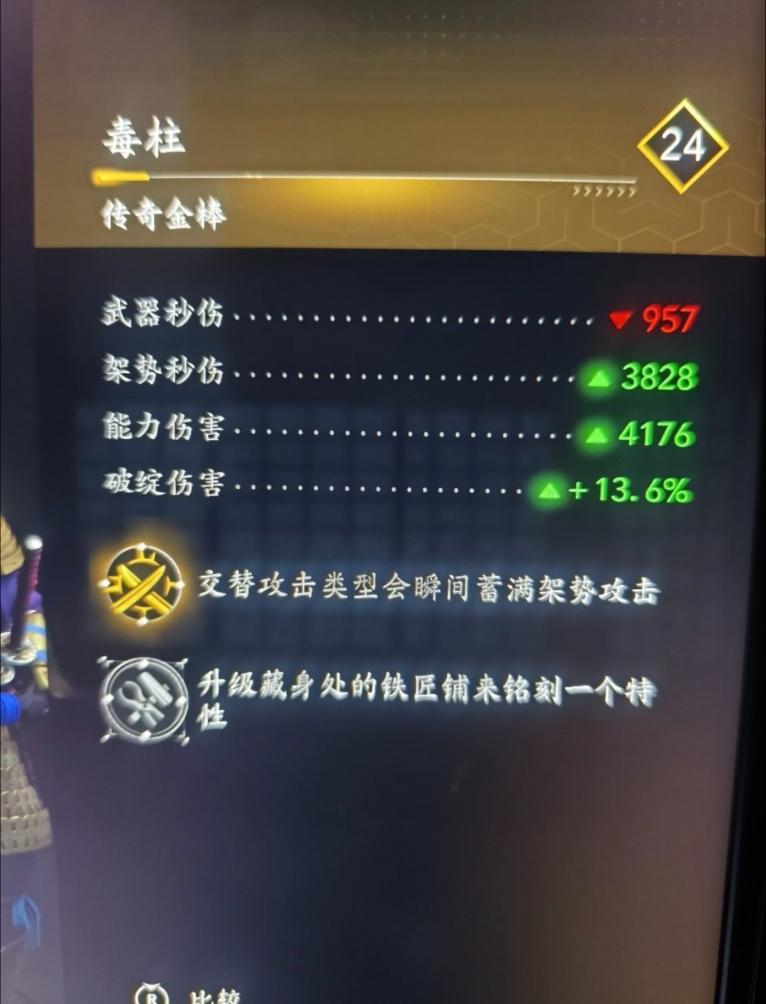 武器特效是交替攻击类型可以瞬间蓄满架势攻击,打正面战斗特别好用。