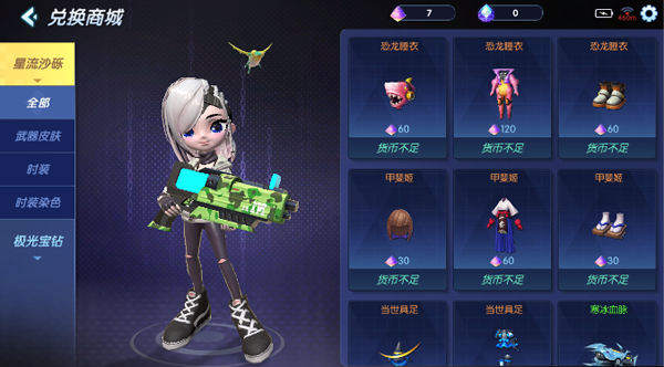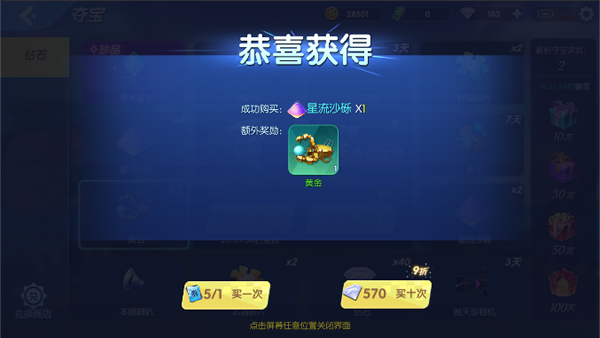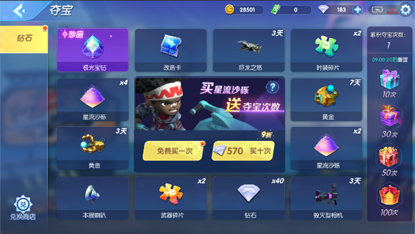 在夺宝中购买的星流沙砾以及获得的极光宝钻,可以在夺宝的兑换商城中兑换永久的极品武器、武器皮肤、时装、时装染色等相关物品。