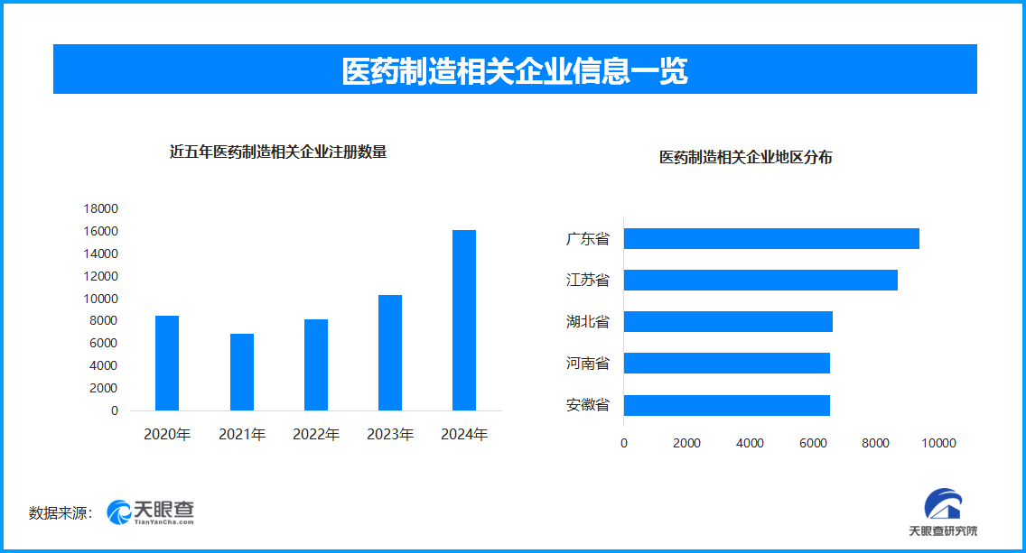 天眼查专业版数据显示,截至目前我国现存在业、存续状态的医药制造相关企业超10.6万家。其中,2025年截至目前新增注册相关企业约1.3万余家,从企业注册数量趋势来看,近五年间,医药制造相关企业的注册数量大体呈现出逐年增长的态势,并在2024年达到顶峰,为1.6万余家。