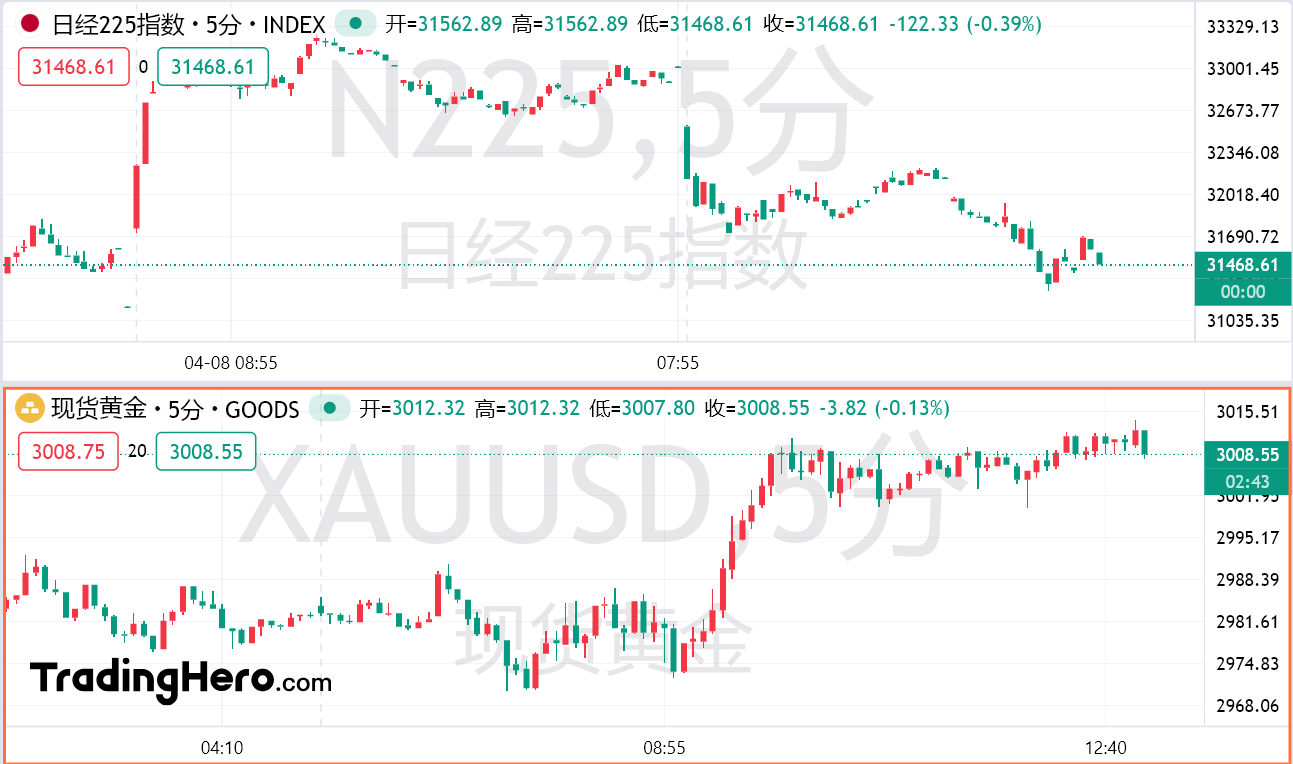 对等关税生效之际,美国国债继续下挫,30年期美债收益率飙升20多个基点至5%上方,亚洲股市在周三的交易中五天内第四次下跌。台湾加权指数跌幅加深至6%,日经225指数日内暴跌5%。现货黄金日内涨幅达1%,突破3010美元/盎司。非美货币走高,日元、欧元兑美元日内涨幅扩大至1%。
