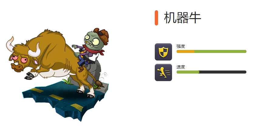 特点:向场地后方抛出小鬼僵尸 弱点:抛出的小鬼僵尸会被高坚果阻挡它不是你想象中的那种愤怒的公牛,它喜欢花,喜欢在田野里奔跑,喜欢在树下乘乘凉,喜欢在草地上打打滚。当遇到那个“她”的时候,它想安定下来成个家。天那,要是它不是一只机器牛就好了。