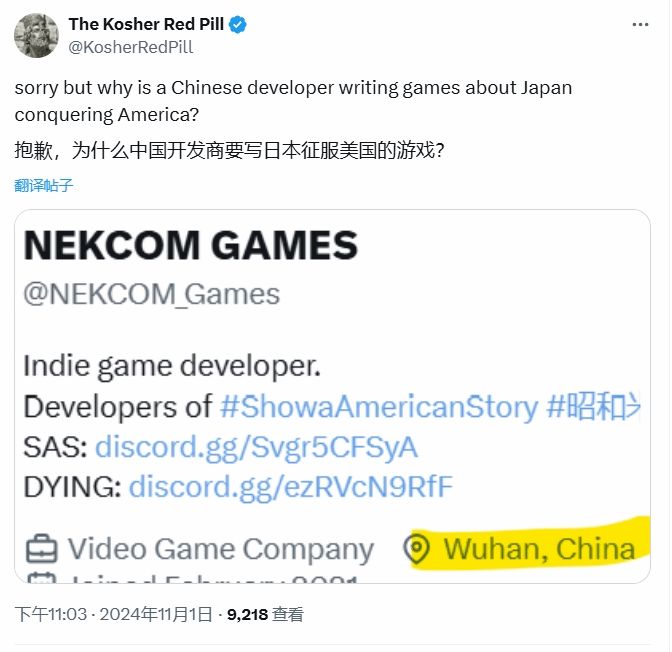 与此同时,也有网友提出疑问:“抱歉,但为什么一个中国开发团队要制作关于日本征服美国的游戏?”对此,评论区的回应十分热烈:“因为他们可以,并且做得很好。”“因为日本没有足够的勇气去做这样一款游戏。”“兄弟,为什么要这么敏感?如果法国人能想出一个关于日本战国时期黑武士的故事……”