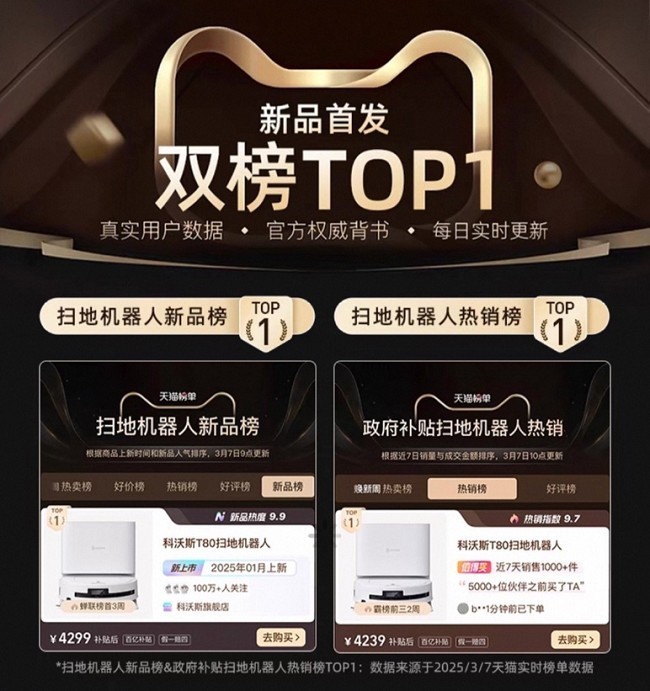 作为2025王炸新品,科沃斯地宝T80一经上市就长期霸榜天猫、京东两大电商的各项榜单TOP1,并且在正式发售后,获得了媒体和消费者的一致好评,可以说是截止目前,口碑、销量皆为第一的扫地机器人产品。