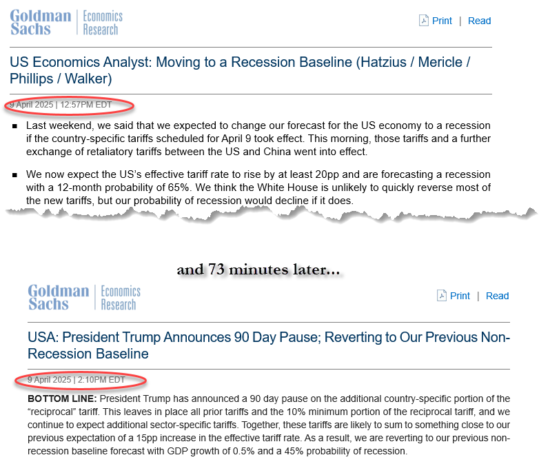 当地时间4月9日,高盛发布衰退预期报告,预计美国未来12个月衰退的可能性为65%。但大概一个小时过后(特朗普宣布暂停关税声明后),高盛又迅速作废了这一预期,目前预计美国经济的衰退概率为45%。