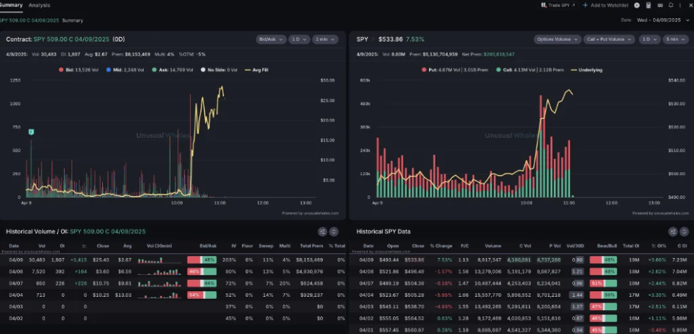 实际上,在特朗普宣布“买入”消息之前,有些交易员已经买入了大量当天到期的SPY 509看涨期权。这些零日期权(0DTE)将在当天收盘时到期,在没有重大看涨消息的情况下几乎没有任何价值。