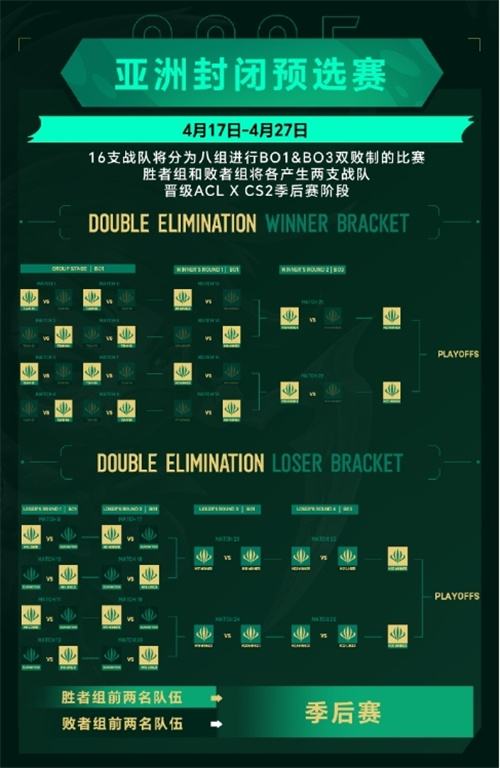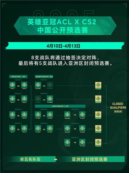 4月10日至13日,晋级中国公开预选赛的8支战队将通过抽签决定对阵,通过BO1及BO3的双败赛制,决出5支战队成功晋级亚洲区封闭预选赛。