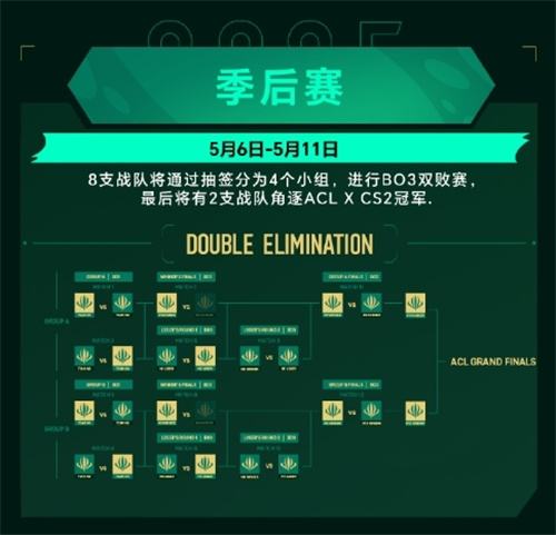 季后赛于5月6日至11日进行。4支晋级战队将与直邀的中国战队TYLOO、LVG,澳大利亚战队Flyquest和蒙古战队The Huns四支亚洲区排名前六战队同台竞技。8支战队将通过抽签分为4个小组,进行BO3双败赛,最后将有两支战队晋级总决赛,于5月16日在上海冲击英雄亚冠ACL x CS2赛事的冠军头衔及直通电竞世界杯的宝贵资格。