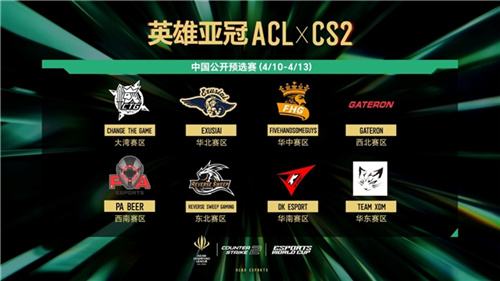 自·2月15日至3月28日,经过英雄亚冠ACL x CS2全国海选赛在国内32个城市的激烈角逐,8支实力强劲的队伍从一千多支队伍中突破重围,成功晋级英雄亚冠ACL x CS2的中国公开预选赛,即将在盐城开启新的征战篇章。他们是Change The Game、Exusiai、FiveHandsomeGuys、Gateron、PA BEER、Reverse sweep gaming、DK ESPORT和 TEAM XDM。
