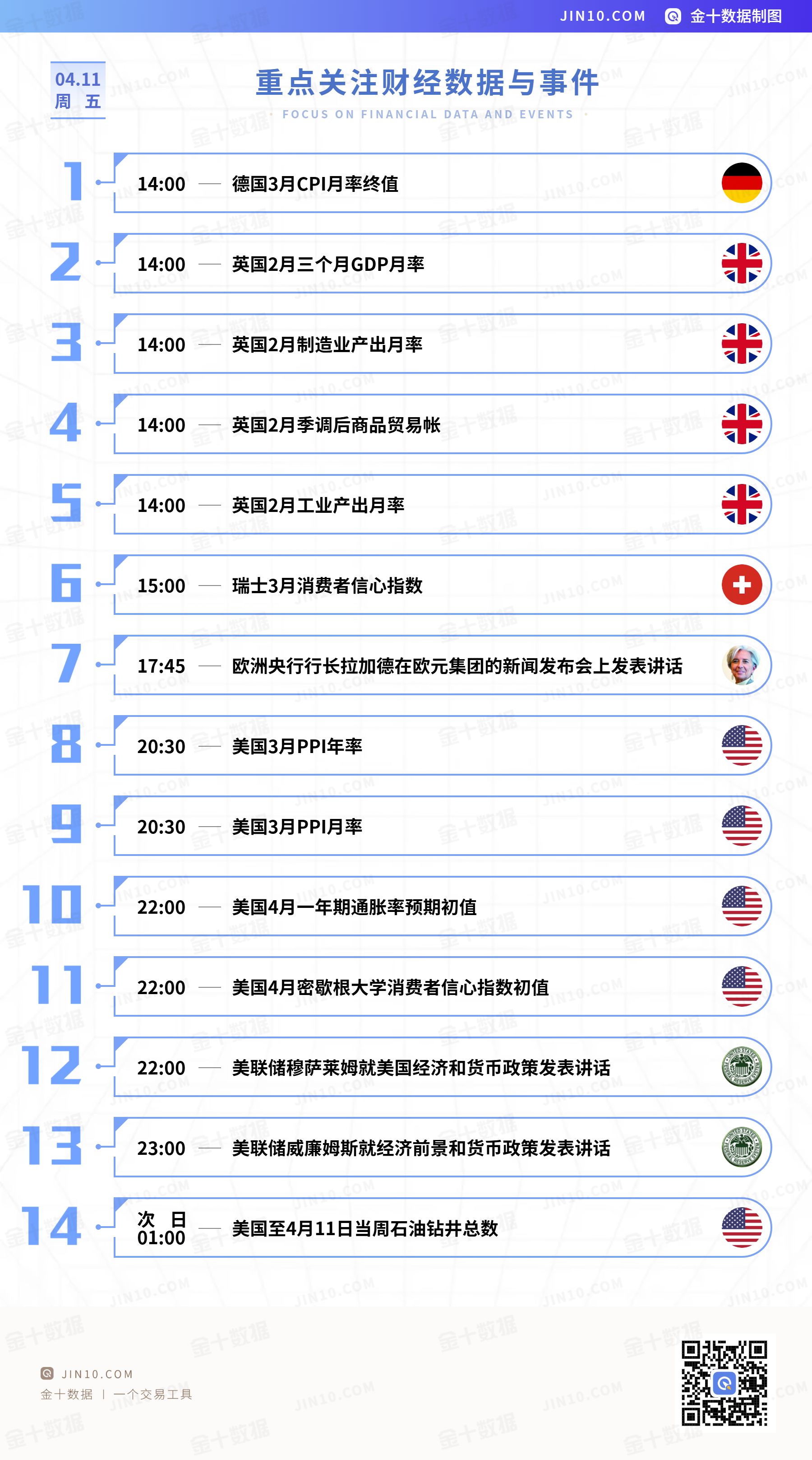 14点,德国将公布3月CPI月率终值,同时,英国也将公布2月三个月GDP月率、2月制造业产出月率、英国2月工业产出月率以及2月季调后商品贸易帐;