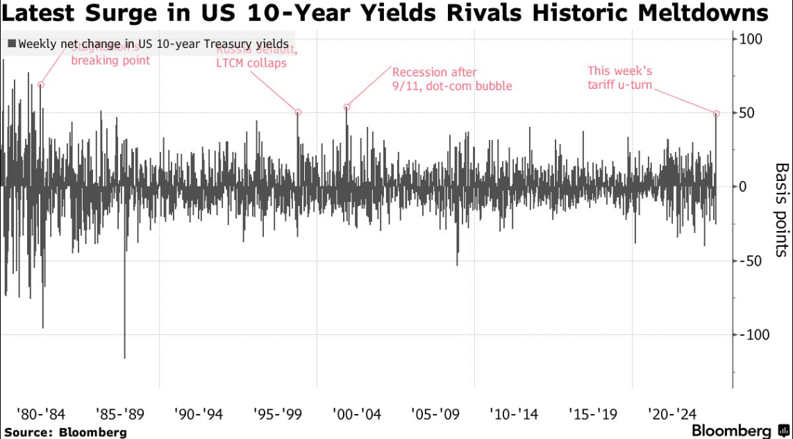 美国总统特朗普的贸易战引发的债券市场大跌使10年期美国国债收益率创下二十多年来的最大单周涨幅,投资者纷纷撤出美国资产。