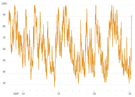 Barclays的高收益债“投降指数”自3月底以来飙升34个百分点,达到91%,为2023年10月以来最高水平——当时也是因为通胀担忧导致美债收益率暴涨。