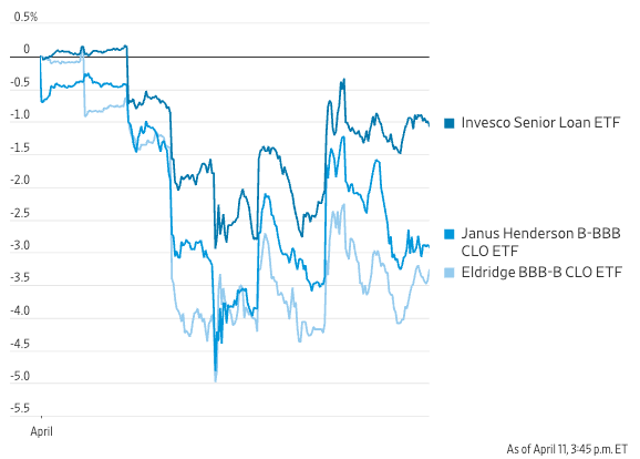 Invesco管理的一支杠杆贷款ETF本月下跌约1%。更令人担忧的是,Janus Henderson和Eldridge Capital Management两家机构所管理的CLO(担保贷款债券)基金跌幅已接近3%。
