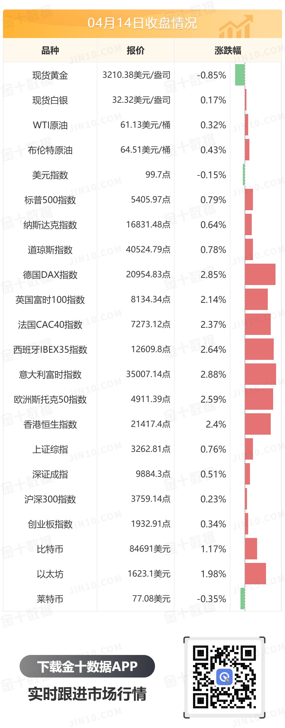 因白宫免除了一些智能手机和电脑的高额关税,市场风险情绪有所改善。现货黄金有所回调,盘中一度跌超1%,并失守3200美元大关,但随后又收复部分失地,最终收跌0.85%,报32210.38美元/盎司。现货白银在32美元附近震荡,最终收涨0.17%,报32.32美元/盎司。