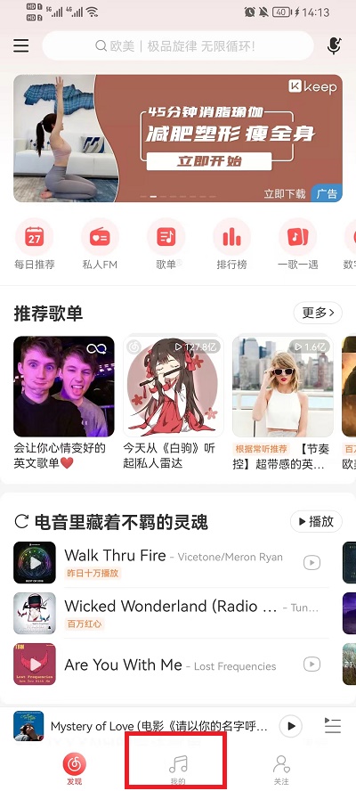 1、在网易云音乐中,点击其中【我的】;
