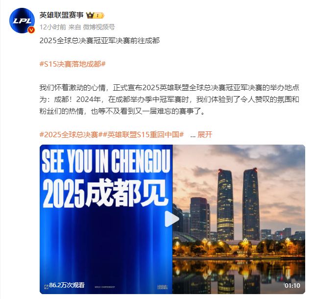 今晚就将举行《英雄联盟》2024全球总决赛冠亚军决赛,BLG将对战T1,两个赛区的宿命之战即将打响。《英雄联盟》赛事官方在昨天宣布,2025全球总决赛冠亚军决赛将前往成都!